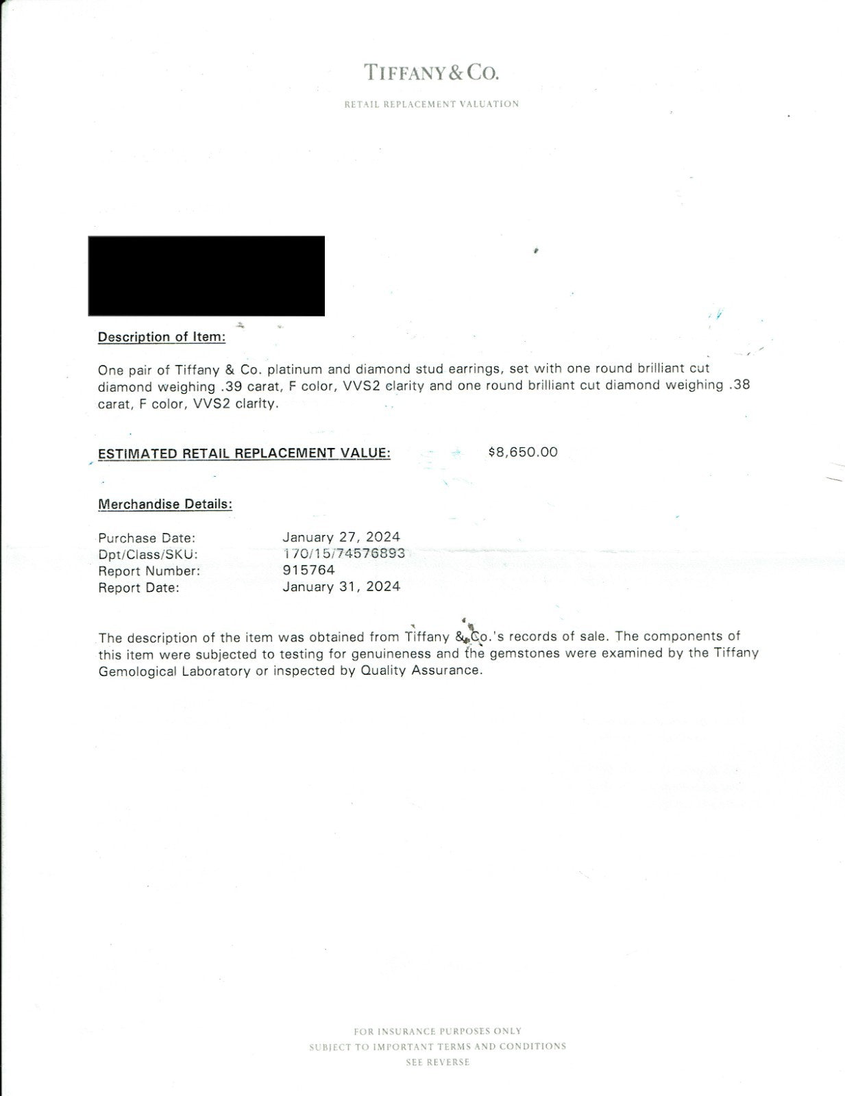 Includes: T&C Diamond Report - T&C. Inner & Outer Earring Box - T&C Original Appraisal