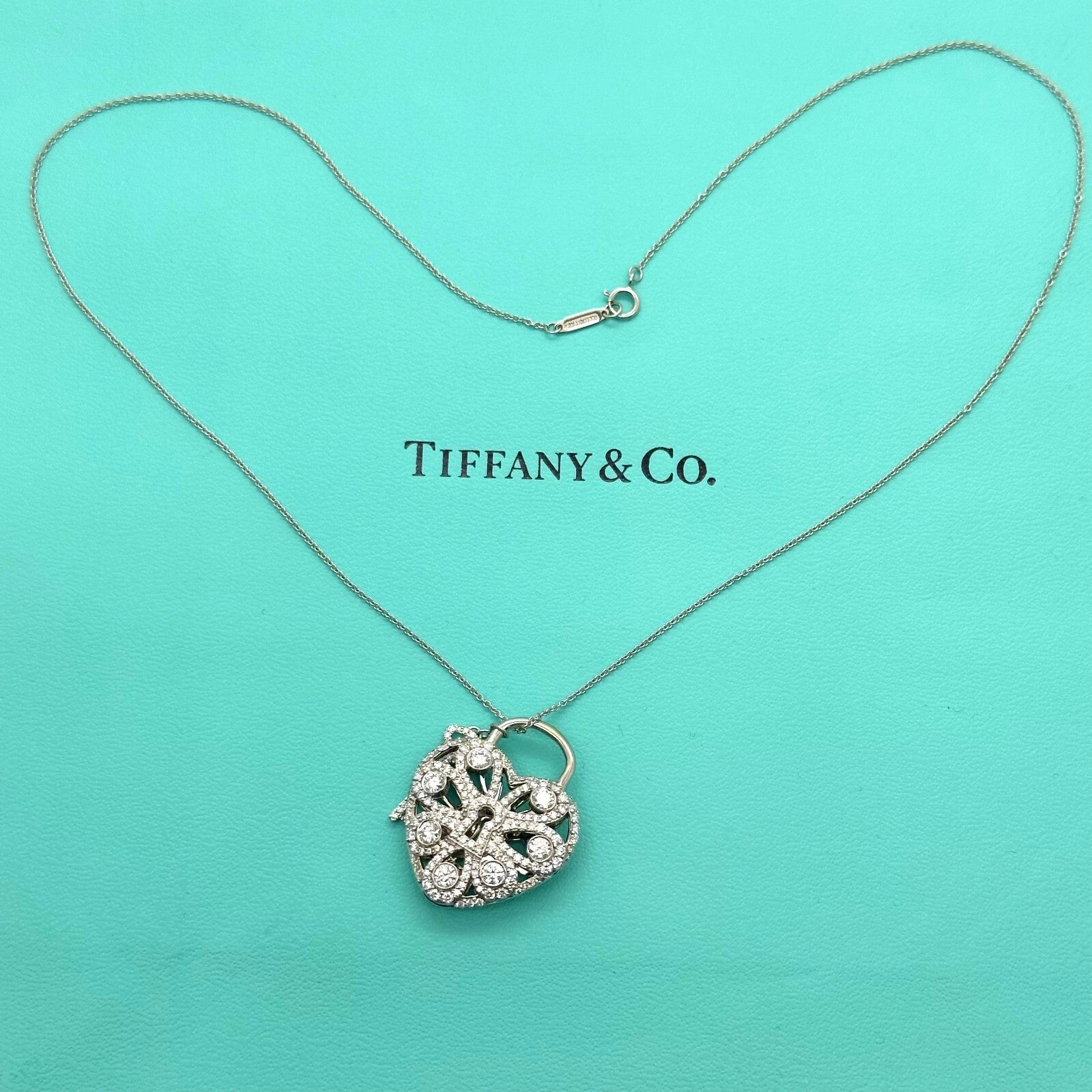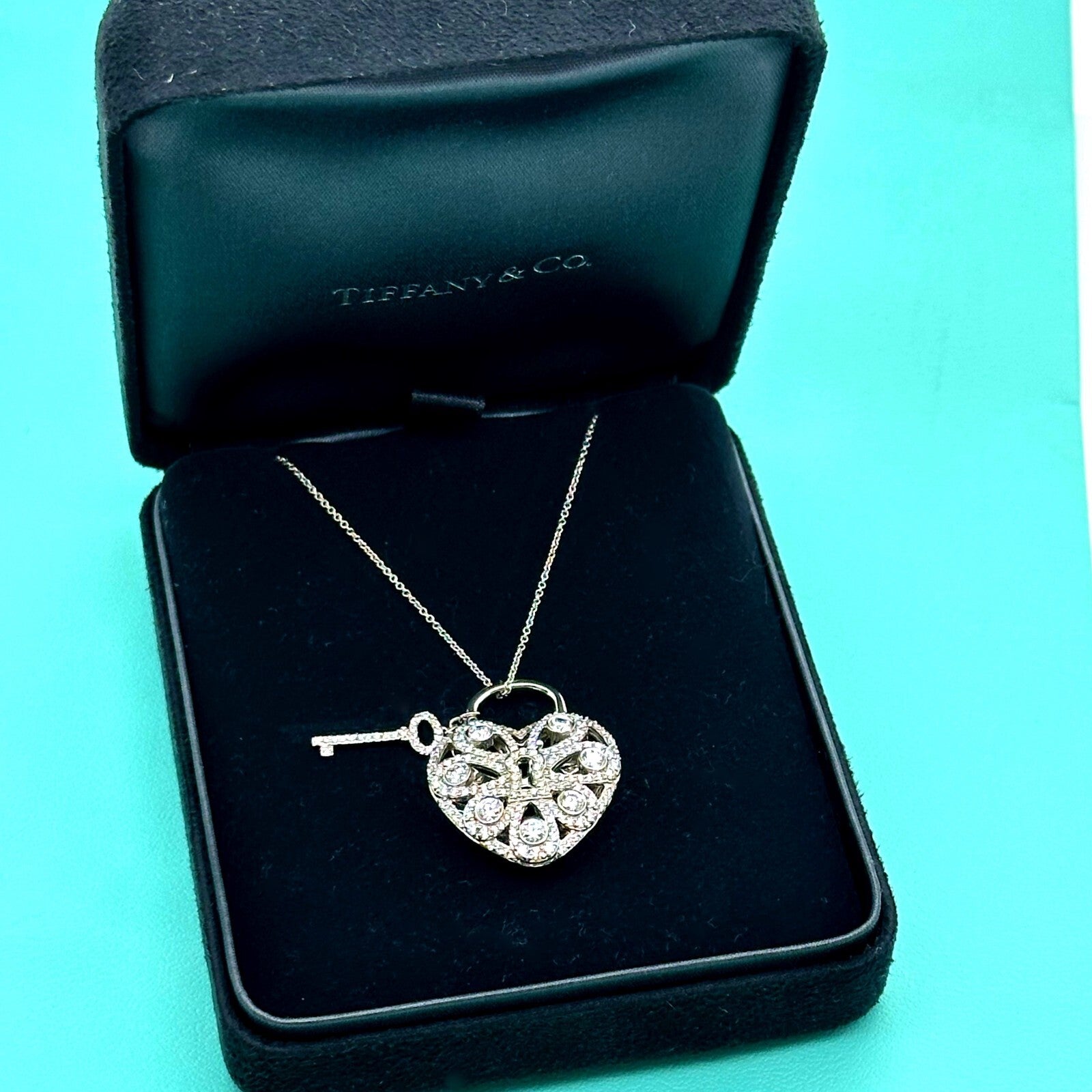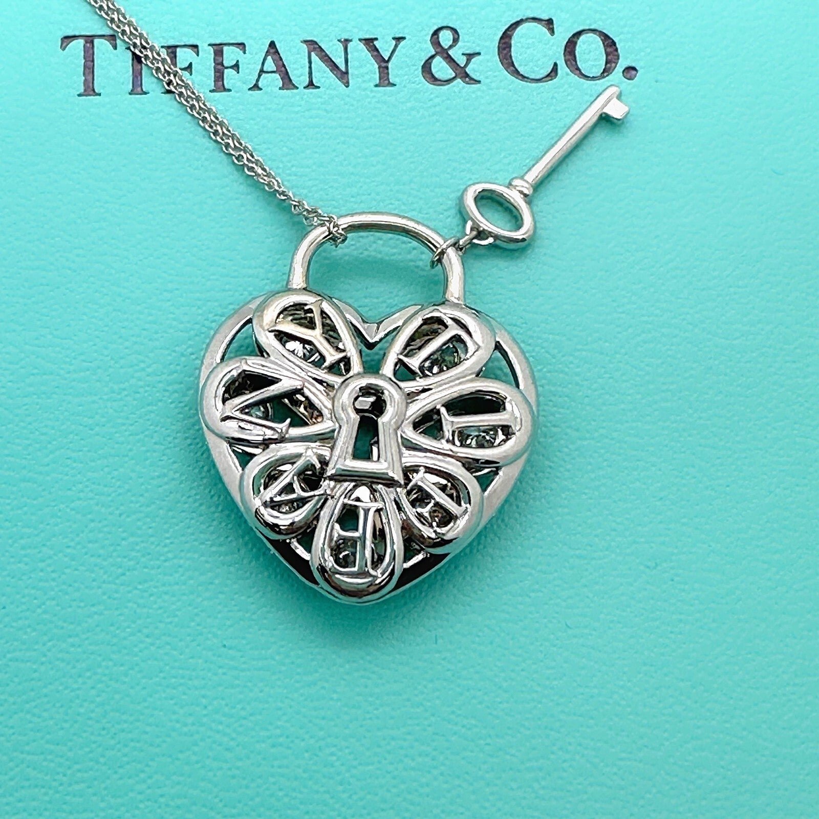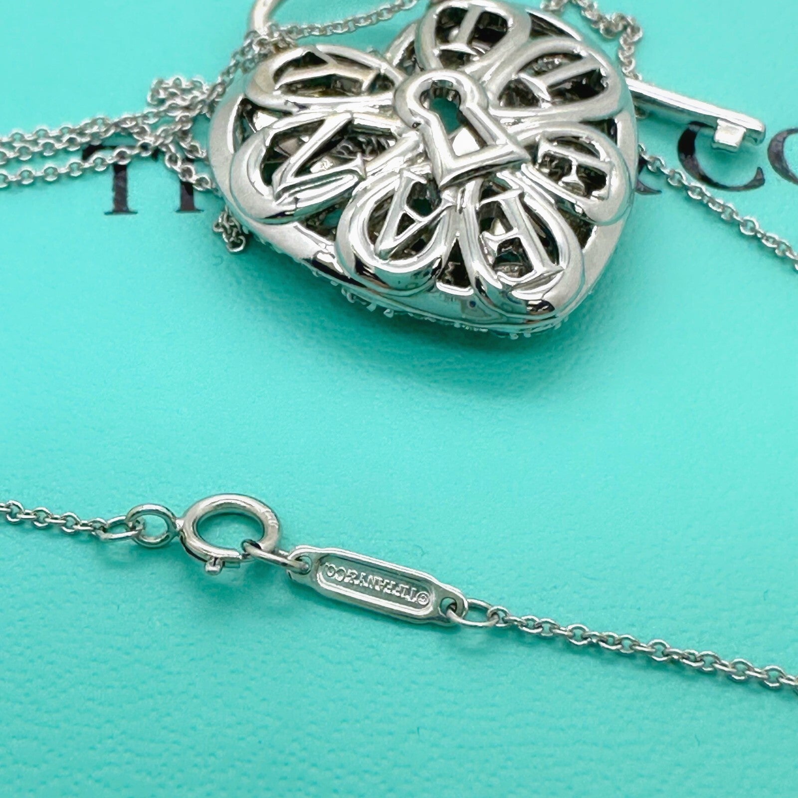 Tiffany & Co Large Filigree Heart Key Diamond Pendant Necklace 18K White Gold