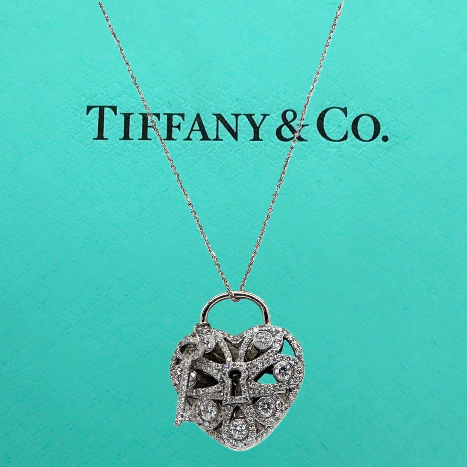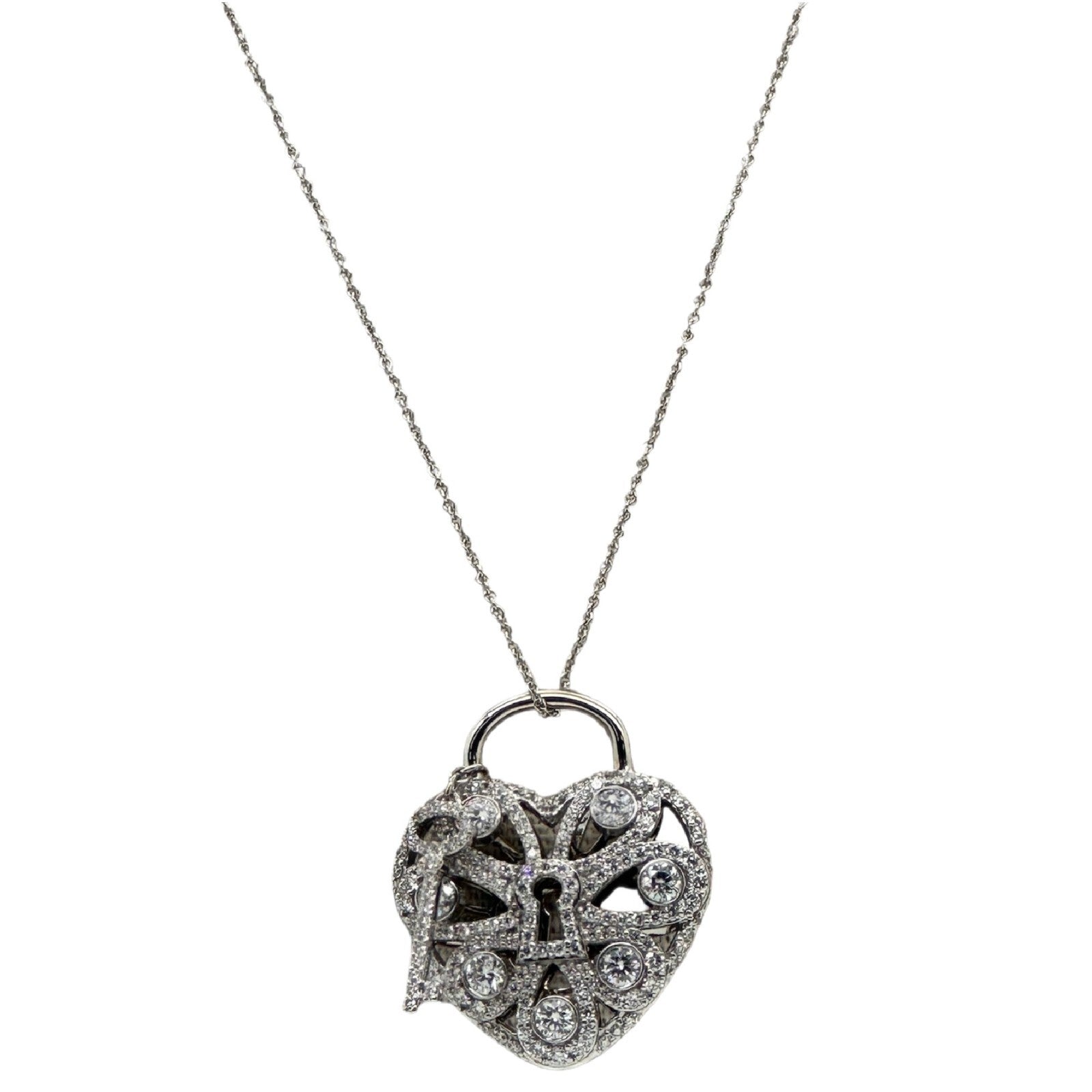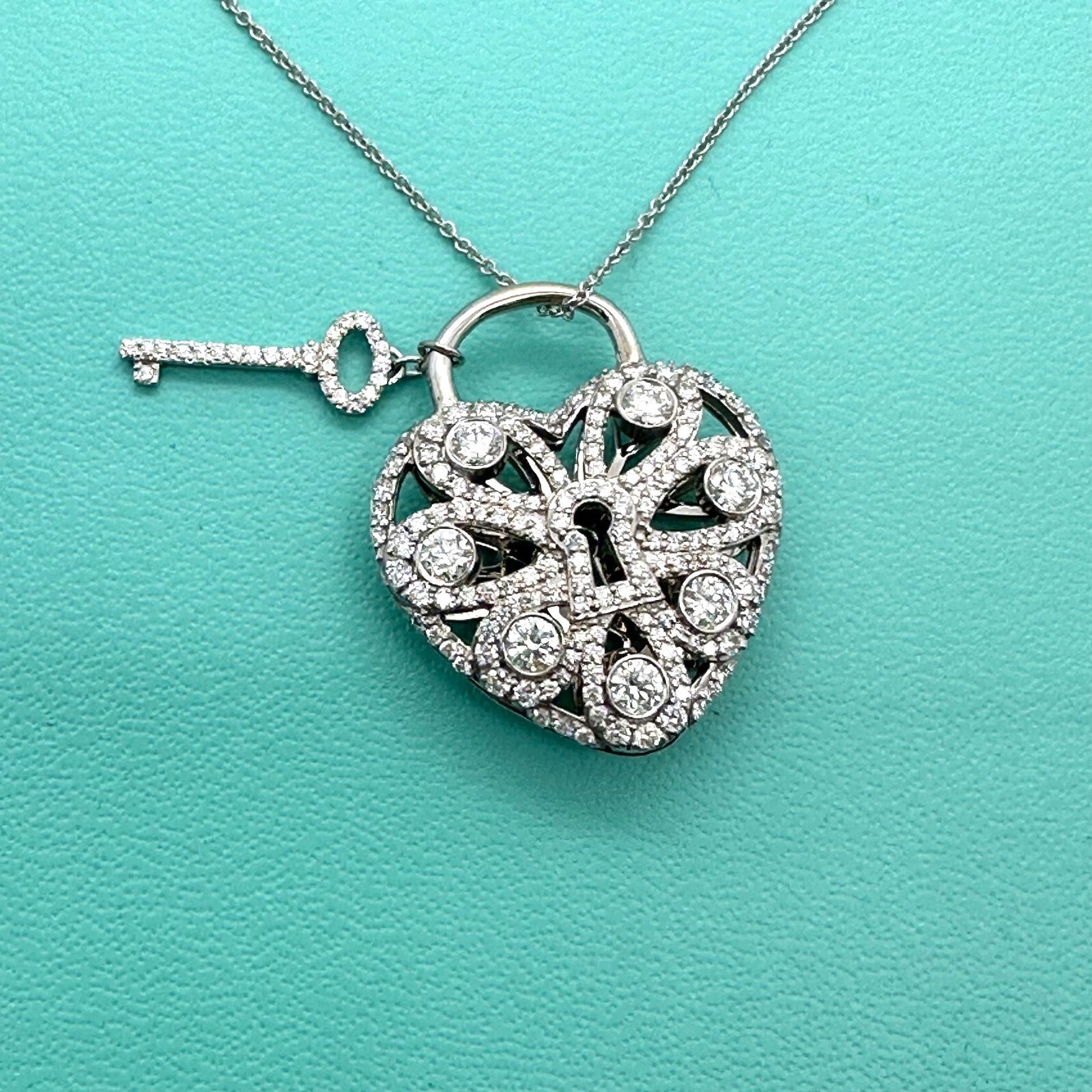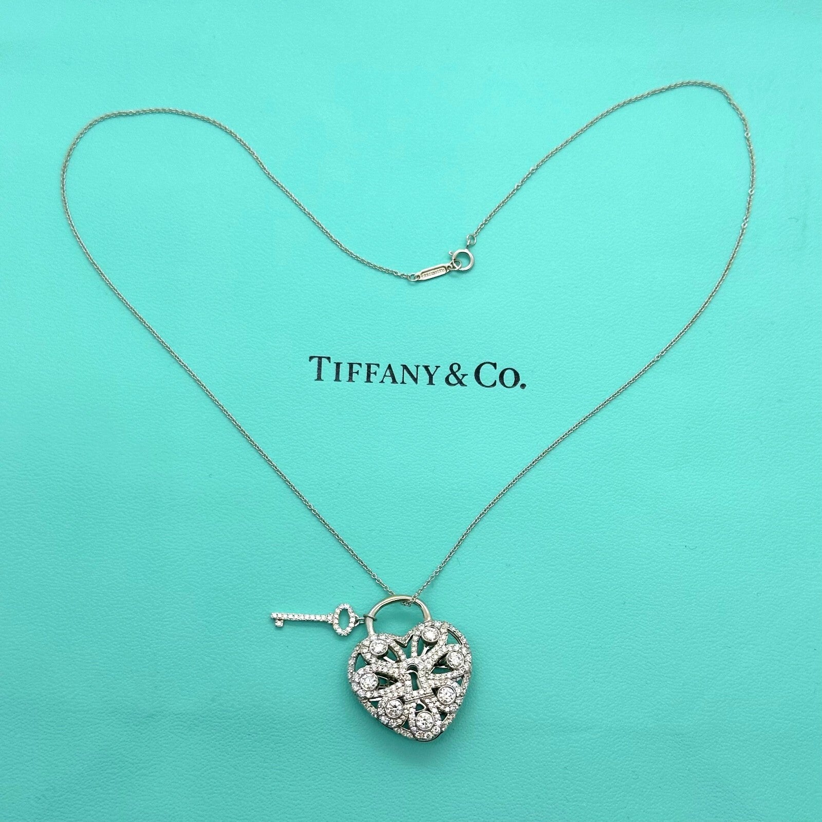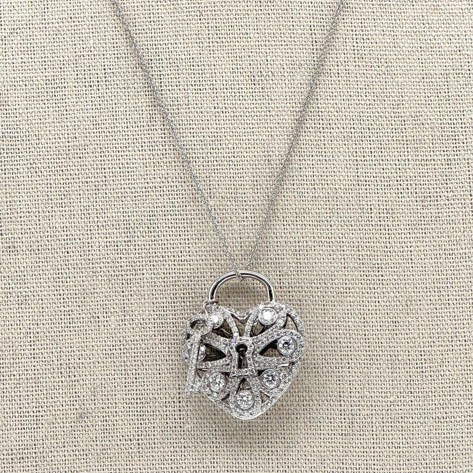 Tiffany & Co Large Filigree Heart Key Diamond Pendant Necklace 18K White Gold