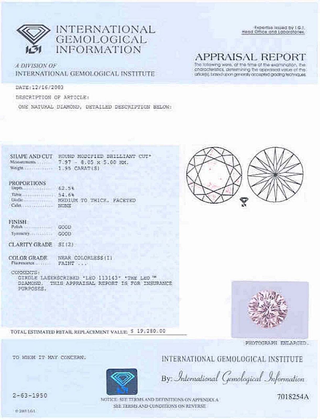 Inscription: Diamond inscribed on girdle " LEO 113143 "